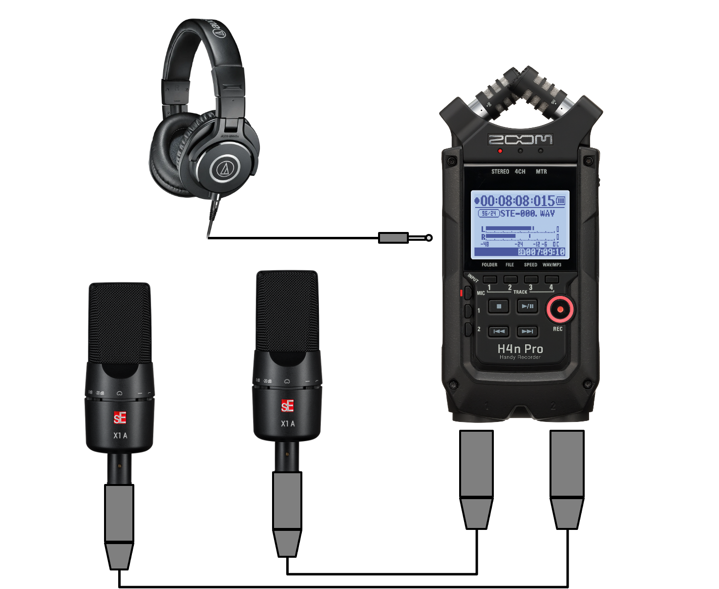 - Podpiąć mikrofony do rejestratora, interfejsu lub miksera.