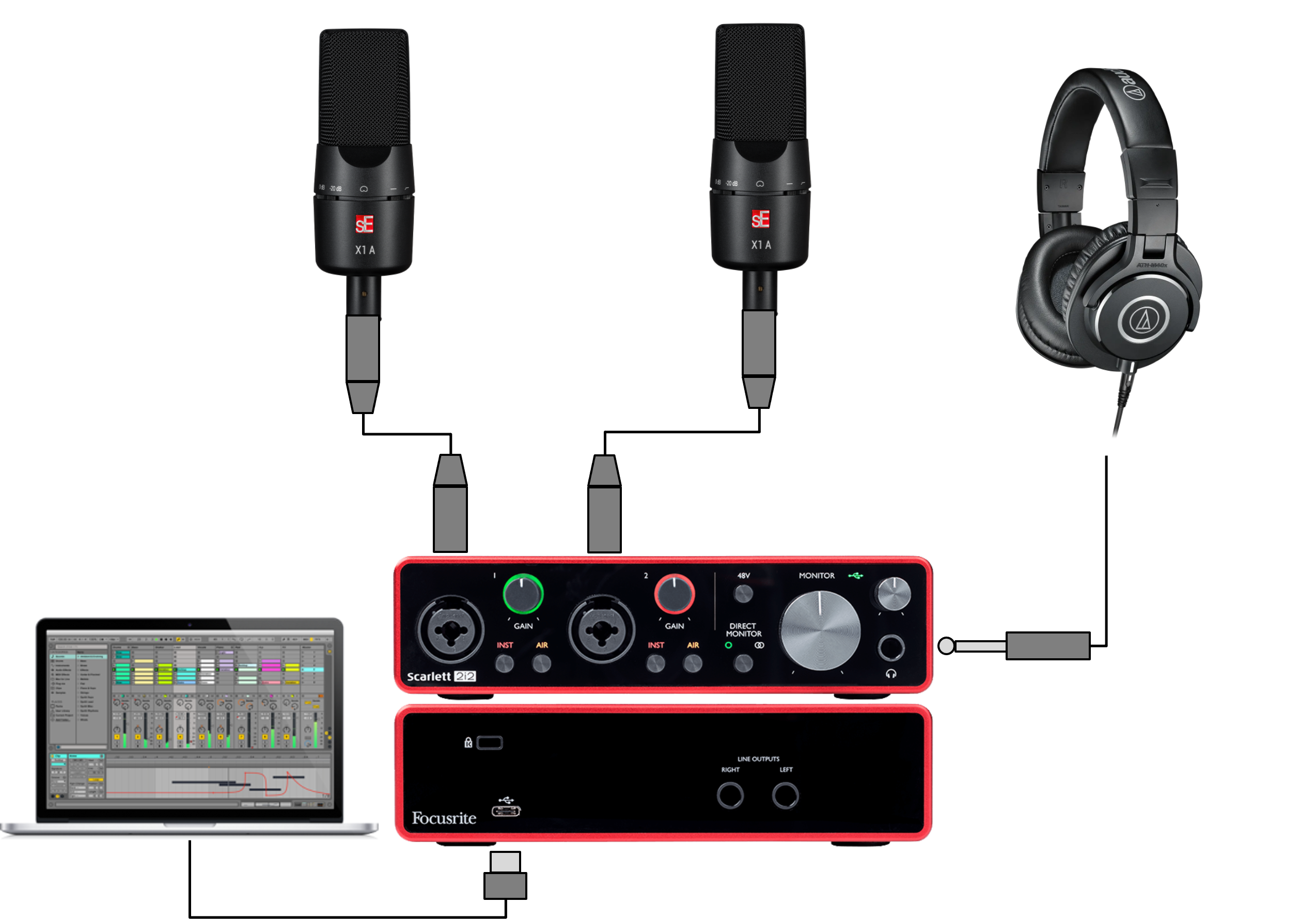 Podłącz sprzęt według schematu producenta. Poniżej załączamy możliwe schematy połączeń 1 i 2. Zainstaluj mikrofony w odpowiedniej odległości i odpowiednio ustawione w stosunku do źródła dźwięku – ust. Sprawdź poziomy sygnałów wchodzących. Nagraj fragment i odsłuchaj.